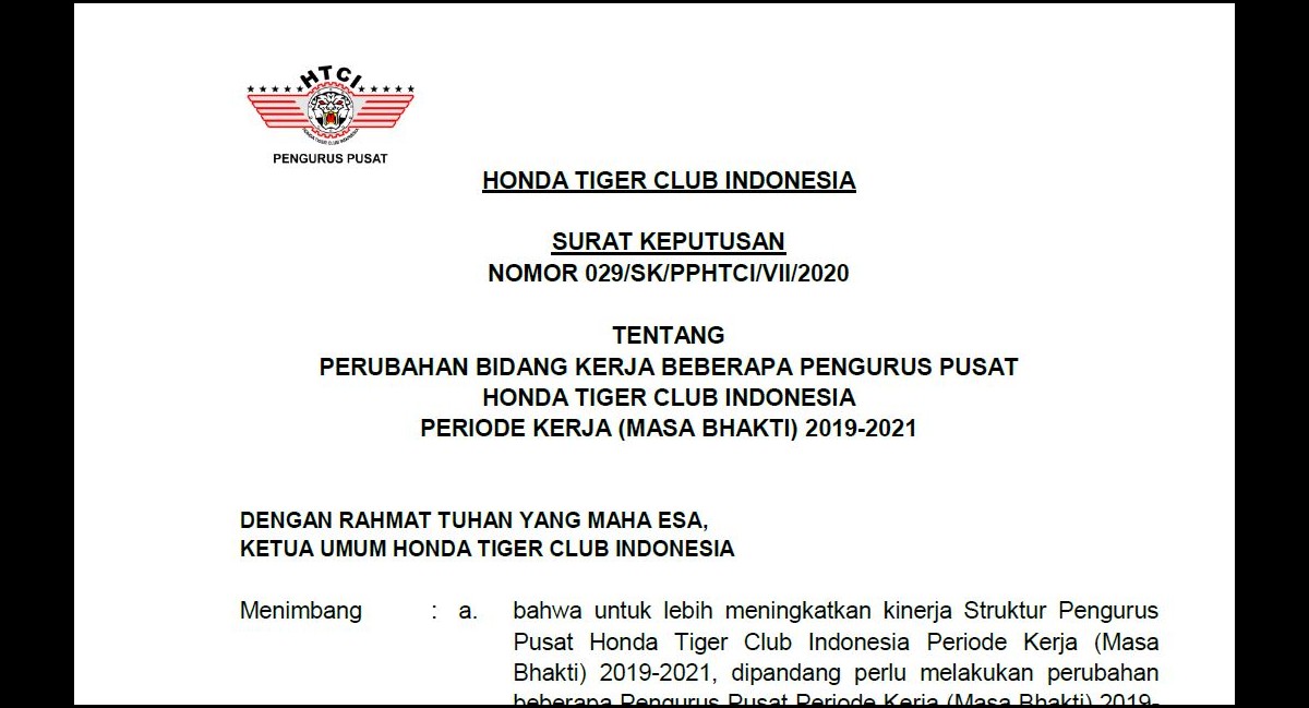 B erdasarkan SK Nomor 029/SK/PPHTCI/VII/2020 tentang Perubahan Bidang Kerja pada PP HTCI masa bakti 2019-2021. Dalam hal ini, diberhentikan dengan hormat sdr. M. Ockta dari jabatannya sebagai Kabid. Sosial, dan digantikan oleh Sdr. Jones Sangari yang sebelumnya menjabat sebagai Anggota tim progja.